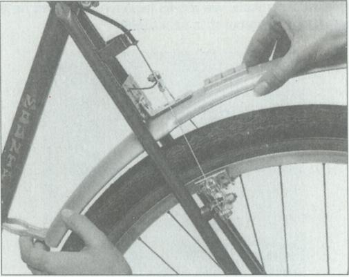 Létezik még a gumira ható első fék, ahol általában egy állítható rudazat végére erősített gumi rányomódik a külső gumira, és így fékezi a kerékpárt (37/a ábra). Főleg gyermekkerékpárokon alkalmazzák. Minden első fék esetében veszélyes a hirtelen fékezés, hiszen könnyen áteshetünk az első keréken, ezért célszerű a fékezést a hátsó fék működtetésével kezdeni.