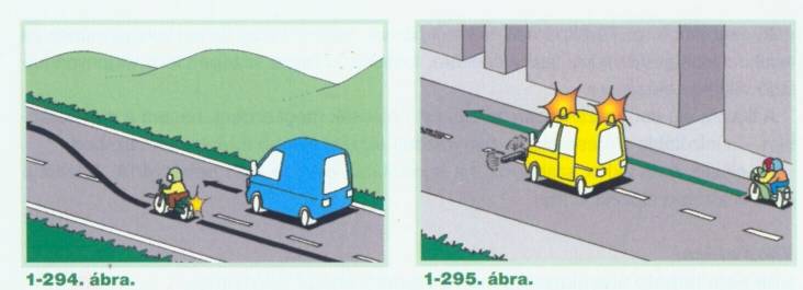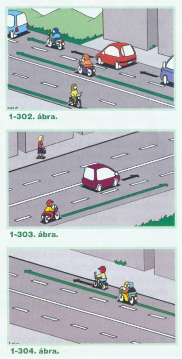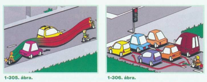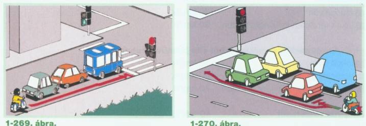 Szabálytalanul halad az a motorkerékpáros, aki a forgalmi okból álló járművek mellett az útkereszteződésig előrelopakodik (1-269. ábra). Ezt az úttest felezővonalához húzódva sem teheti meg (1-270. ábra).