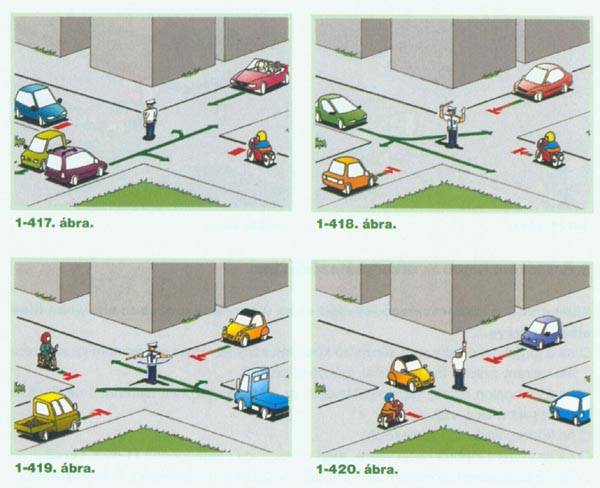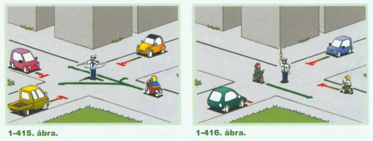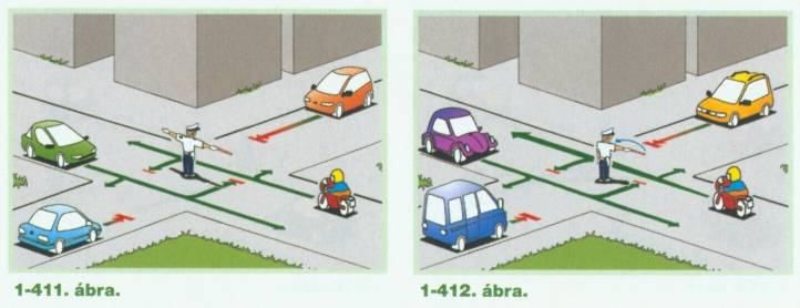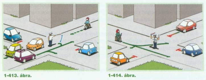jelnél, ezek hiányában az útkereszteződés előtt. Karjelzés hiányában a rendőr